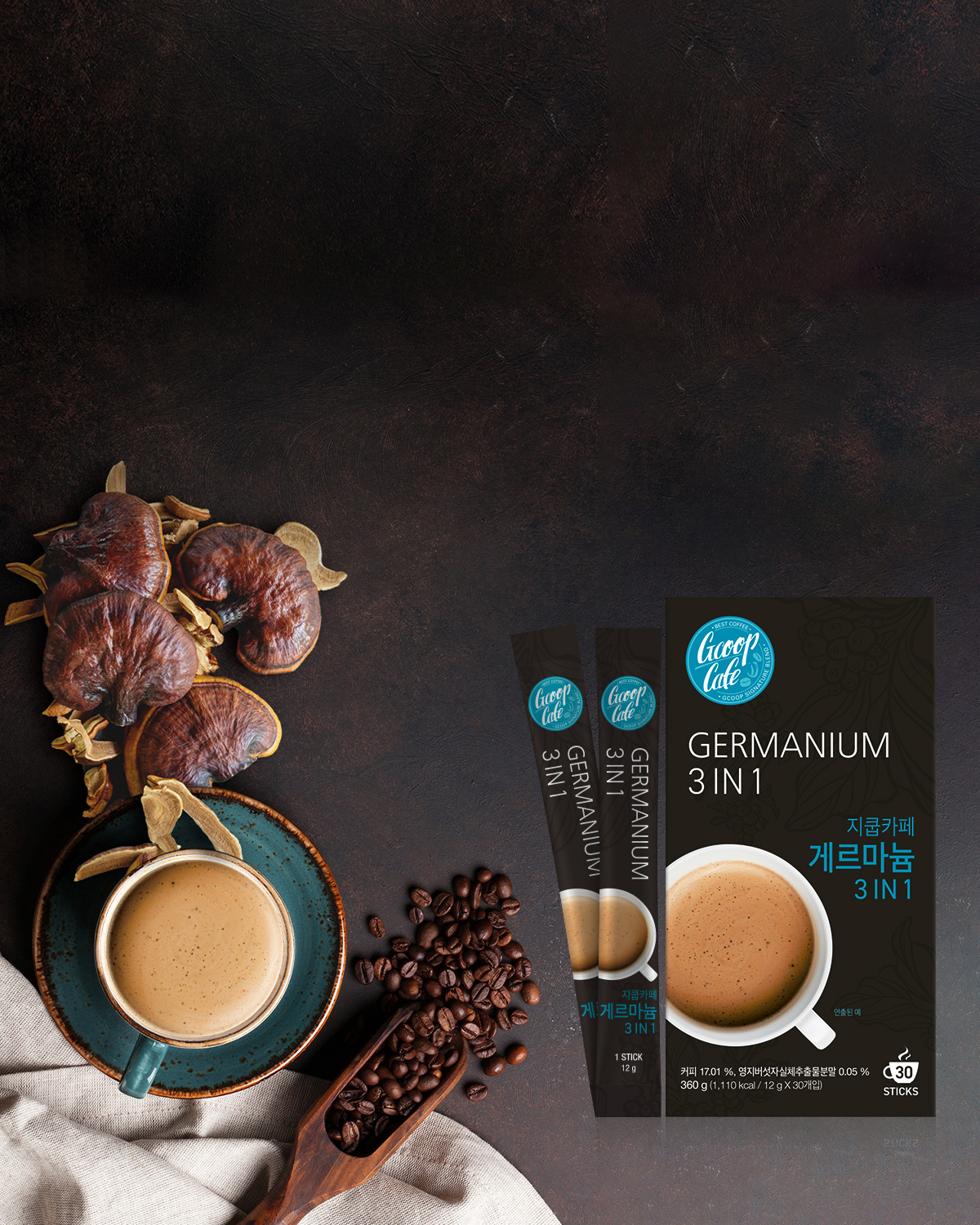 영지버섯 게르마늄 50ug, 베타글루칸 730mg, 폴리페놀 150mg을 커피 한잔에!